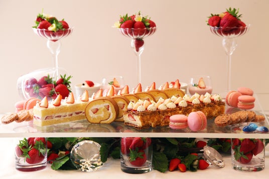 パティシエ自慢のストロベリースィーツが約20種&フレンチオードブルが約15種!さらにイチゴのスムージーや数種類のトッピングで楽しむパフェ、目の前で仕上げるいちごのフランベデザート、モンブランも登場♪