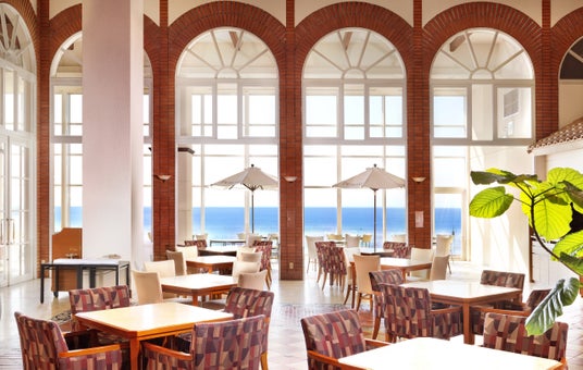 ご当地スイーツや軽食を窓一面に広がる海を眺めながら、ゆったりいただける絶景カフェ。