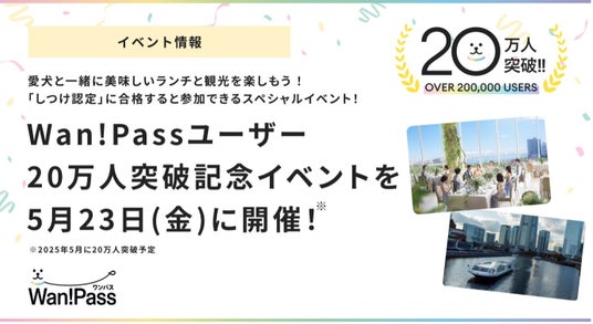 ペッツオーライ株式会社(本社:東京都中央区、代表取締役CEO:小早川斉、以下ペッツオーライ)は、ペットとのお出かけを支援するアプリ「Wan!Pass(ワンパス)」の累計ユーザー数20万人突破(5月予定)を記念し、20組限定のスペシャルイベント”愛犬と一緒に美味しいランチと観光を楽しもう”を2025年5月23日(金)に開催します。