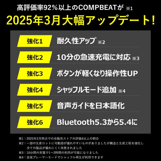 特にCOMPBEATの特徴であるイヤホンタイプ切り替え機能の構造と生産工程を見直し、耐久性が大幅に向上しました。1年保証付きなので安心してご利用いただけます。