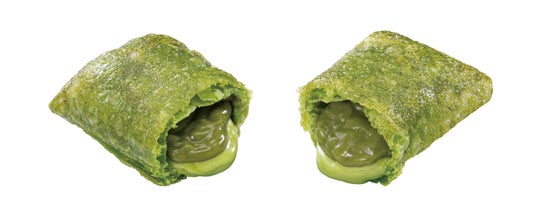 商品概要:宇治抹茶クリームと、宇治抹茶を合わせたホワイトチョコレートクリームの2層に仕上げたフィリングを、サクサク食感のパイ生地で包みました。宇治抹茶の味わいを手軽に楽しめるワンハンドスイーツです。