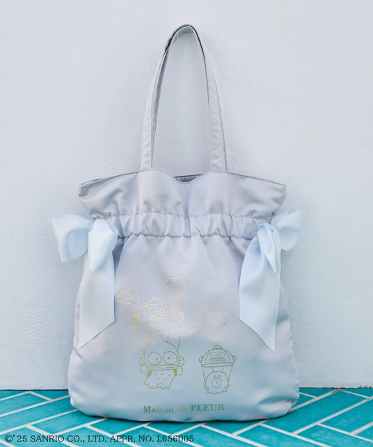 また、サテン生地のダブルリボントートバッグは、スカイダイビングを楽しむ様子をフロントに箔プリントし、同素材のポーチには、さゆりとハンギョドンを刺繍。トートバッグとポーチにあしらったリボンは、ハンギョドンの青いヒレを思わせる鮮やかなサックスで大人可愛く仕上げました。