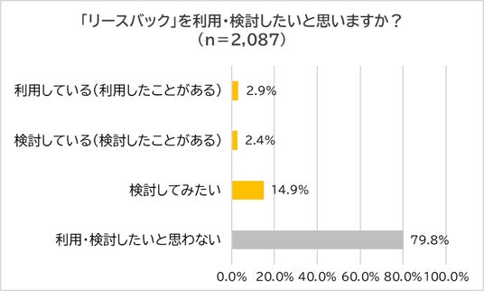 次に、「リースバックを利用・検討したいと思うか?」と尋ねたところ、最も多い回答は「利用・検討したいと思わない」(79.8%)であり、次いで「検討してみたい」(14.9%)となりました。「利用している(利用したことがある)」(2.9%)や「検討している(検討したことがある)」(2.4%)と答えた人はわずかでした。
