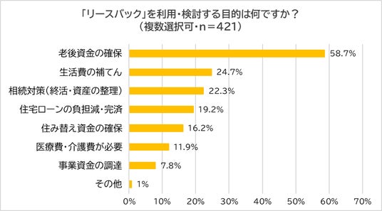 リースバックを「利用している(利用したことがある)」「検討している(検討したことがある)」「検討してみたい」と答えた421名に、「リースバックを利用・検討する目的」について尋ねたところ、最多は「老後資金の確保」(58.7%)で、続いて「生活費の補てん」(24.7%)、「相続対策(終活・資産の整理)」(22.3%)、「住宅ローンの負担減・完済」(19.2%)、「住み替え資金の確保」(16.2%)、「医療費・介護費が必要」(11.9%)、「事業資金の調達」(7.8%)となりました。