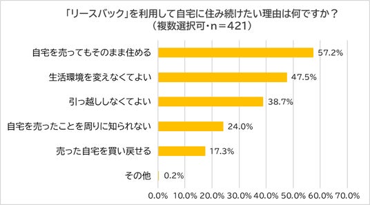さらに、「リースバックを利用して自宅に住み続けたい理由」について尋ねたところ、「自宅を売ってもそのまま住める」(57.2%)が最多で、次いで「生活環境を変えなくてよい」(47.5%)、「引っ越ししなくてよい」(38.7%)、「自宅を売ったことを周りに知られない」(24.0%)となりました。一方、「売った自宅を買い戻せる」と前向きな回答は17.3%に留まりました。