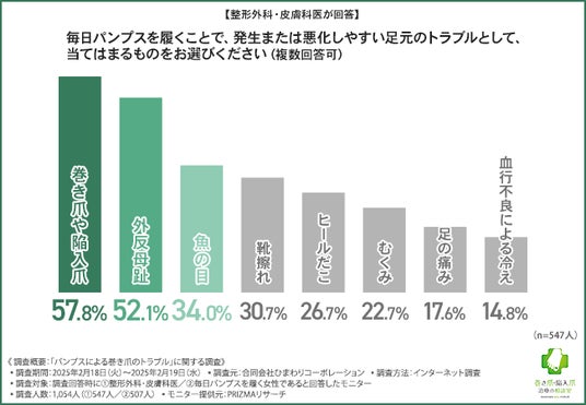 そこで今回、「専門医と学ぶ巻き爪・陥入爪治療の相談室」(https://medical-media.jp/)を運営する合同会社ひまわりコーポレーションは、1.整形外科・皮膚科医/2.毎日パンプスを履く女性を対象に、「パンプスによる巻き爪のトラブル」に関する調査を実施しました。