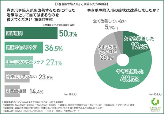 続けて、治療といった選択を取った方に「巻き爪や陥入爪の症状は改善しましたか?」と質問したところ、約7割の方が『とても改善した(19.6%)』『やや改善した(48.5%)』と回答しました。