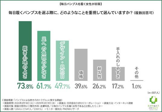 「毎日履くパンプスを選ぶ際に、どのようなことを重視して選んでいますか?(複数回答可)」と質問したところ、『履き心地のよさ(73.8%)』と回答した方が最も多く、『足への負担の少なさ(61.7%)』『デザイン・見た目(49.7%)』と続きました。