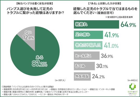パンプス選びの失敗が足元のトラブルに繋がった経験をしている女性は約9割で、「靴擦れ」「足の痛み」「巻き爪や陥入爪」などのトラブルが生じています。