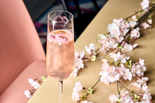 「W XYZ Bar」では4月春テーマにした「桜焼酎スプリッツ」というカクテルをご用意いたします。焼酎と桜スパークリングリキュールに桜の花びらをまぶした、春の始まりを楽しむ最適のカクテル。