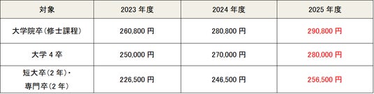 当社の成長を担う優秀な人材確保に向けた採用力の強化を図るため、2025年4月入社社員より従来比1万円引き上げます(諸手当含む)。