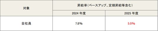 以下の観点から、2025年4月1日より全社員一律で1万円のベースアップを実施いたします。ベースアップと定期昇給を含めた引き上げ幅は全体で平均5.0%となります。