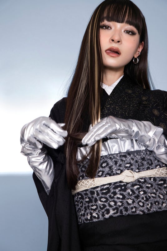 豹柄の帯やシルバーアイテム、厚底ブーツがアクセントとなった強めなスタイリングに仕上げました。