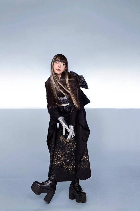 黒染め振袖の持つ圧倒的な印象を活かしつつ、Y2Kギャルらしい大胆でアグレッシブなコーディネートが魅力。