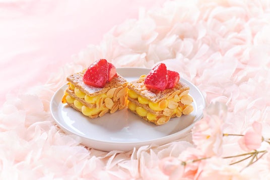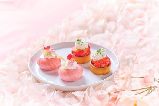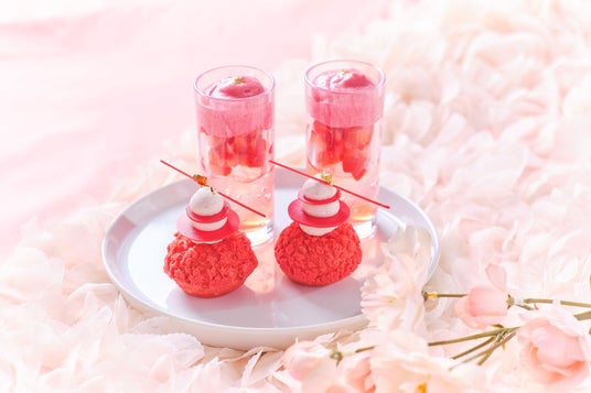 シャンパンといちごが好相性のグラスデザートや、いちごのクリームがぎっしり詰まった可愛いらしいフォルムの赤いクッキーシュー、さっぱりとしたグレープフルーツジュレを忍ばせたいちごのムース、ピスタチオクリームを詰めて焼き上げたいちごのタルト、サクサクのパイ生地に濃厚なカスタードクリームをサンドしたナポレオンパイなどいちご尽くしのスイーツ5種を提供。セイボリーは、フォアグラムースとピスタチオを使用した贅沢ミルフィーユや、黒胡椒を効かせたポークパストラミとラズベリー風味のクリームチーズのブルスケッタ、素材の味を活かした蕪のクリームスープの3種をお楽しみいただけます。