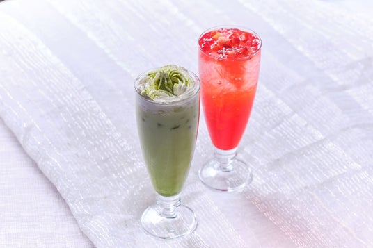 <スペシャルドリンク>右:ジュエルストロベリーソーダ/左:ホワイトグリーンティー(オプション)