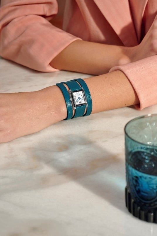 フランケ装飾が際立つ、シルバーカラーのローマン(レクタンギュラー)ダイアルを備えた3 つのバージョン。繊細な幾何学模様のエンボス加工がギョーシェ彫りの効果を生み出し、ペイントされたローマ数字とブルースティール針により文字盤のデザインが完成します。6 時位置には正方形のスモールセコンドを配しました。これらのモデルにはナッパレザーのダブルツアーストラップが組み合わされ、ブラック、アイボリーのトップステッチを効かせたベージュゴールド、ピンクの3 色をラインナップ。ベージュゴールドとピンクの2 モデルには、38 個のトップ・ウェッセルトン・ダイアモンドをあしらいました。