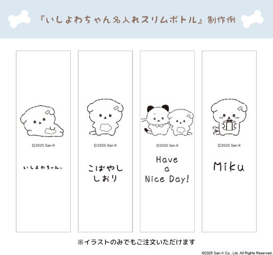 「いしよわちゃん 名入れスリムボトル」に刻印できるイラストはこちらの4種類。どこか意志の弱さを感じてしまういしよわちゃんはもちろん、意志が強くてストイックないしよわちゃんの会社の同僚・いしつよちゃんも登場しています。