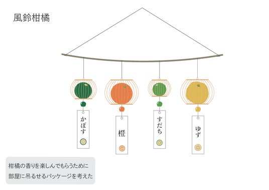 コンセプト:ゆず、橙、かぼす、すだちにはそれぞれ香りに違いがあると思います。パッケージを通じて香酸かんきつの「香り」を多くの人に楽しんでもらいながら、この食材について知ってもらいたいと考えています!香りを感じやすくするためにはどうしたら良いか考えた時に、香酸かんきつを吊るすというアイデアが浮かびました。柑橘類の爽やかさや涼し気な感じを表現するために、風鈴をモチーフにしながらパッケージをデザインしました。