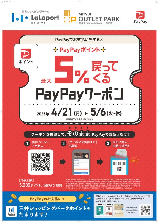 応募方法:ららぽーと門真・三井アウトレットパーク 大阪門真の店舗で 三井ショッピングパークポイントの対象カードまたはポイントQRコードをご提示の上、 5,000円(税込・合算可)以上のショッピングで応募可能。