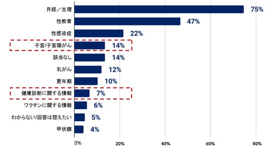 – 学校で習った女性の健康に関するトピックについては「月経(75%)」が最も多く、「性教育(47%)」「性感染症(22%)」「子宮や子宮頸がん(14%)」「乳がん(12%)」の順に。「健康診断に関する情報(地方自治体のプログラム)」は7%程度にとどまる(図表3-1)。