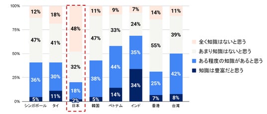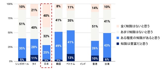 – 子宮頸がん検査または検診に関して「知識は豊富だと思う(3%)」「ある程度の知識があると思う(23%)」と回答した日本の女性は全体の3割を下回り、APAC8カ国・地域中で最も低い結果に。「あまり知識はないと思う(32%)」「全く知識はないと思う(42%)」が全体の7割以上に(図表1-1)。