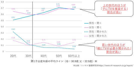 下のグラフは、「子にテレビ購入を推奨する割合」が実線、「親からテレビが必要か聞かれた割合」を破線の折れ線で、男女別で表したものです。そして、「子にテレビ購入を推奨する割合」を調査するために伺った際、子供がいない対象者もいたので、「お子様がいる親という立場」という質問の仕方、つまり「もし子供がいるならば」というif条件の上で聞いた質問にしました。そのため、グラフに黒い縦線を引いており、これは第1子出産年齢の平均値です。黒線の左側は比較的子供がいる率が少なく(“もしも”で答えている割合が高く)、右側は子供がいる率が高いというガイドラインとなります。