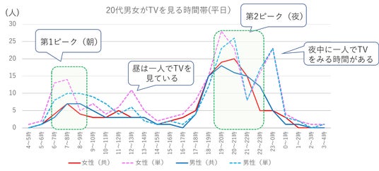 – 20代男女が同居人とテレビをつける時間帯のピークは朝と夜の2つ