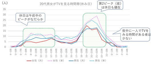 また、昼食は12時頃とした場合、特に20代の女性は「一人でテレビを見る人数が多かった」という結果となった。そして、一人でテレビを見る場合は、22~0時にかけて視聴する人が多いということ、第3のピークが0時前にあるということもわかった。