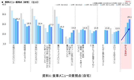 食事メニューの重視点について尋ねた設問では、「手間がかからないこと」が23.2%でもっとも高く、次いで「短時間で作れること」「予算内におさまること」と続きます。特筆すべき変化として、重視点が「ひとつもない」と回答した割合が25.1%で、他の項目と比べて最も高い結果となっています(資料4)。