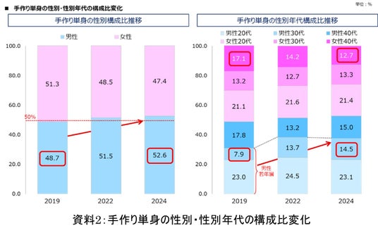 2019年から2024年の5年間で、手作りをする単身者の男性比率が48.7%から52.6%に上昇し、女性を上回りました。30代男性は7.9%から14.5%に6.6ポイント増加しています。一方、40代女性は17.1%から12.7%で4.4ポイント減少しました(資料2)。