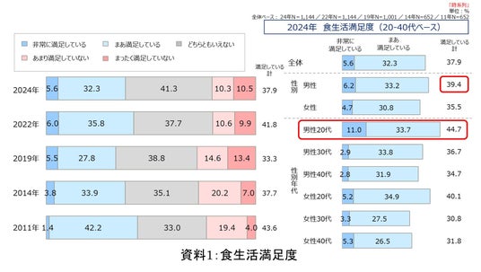 2011年の調査開始以降、食生活に「満足している」(「非常に満足している」と「まあ満足している」の合計)と回答した人の割合は、4割前後で横ばい傾向を示しています。年代別分析では、20代の満足度が高い傾向が顕著であり、特に20代男性は44.7%が満足していると回答しています。男女比較では、男性の満足度が39.4%で、女性より3.9ポイント高い結果となりました(資料1)。
