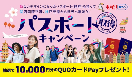 ○概 要:2025年3月24日(月)~2025年8月31日(日)の期間中にパスポートを「新規」または「更新」で取得され、関西国際空港発または神戸空港発の国際線を利用された方の中から抽選で10,000円分のQUOカードPayをプレゼントいたします。