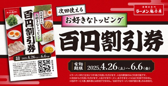 京都北白川ラーメン魁力屋をチェーン展開する株式会社魁力屋(https://corp.kairikiya.co.jp/本社:京都市中京区、代表取締役社長:藤田 宗、以下魁力屋)は、2025年4月26日(土)より「お好きなトッピング100円割引券」を配布いたします。