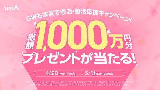 また、GWも恋活を頑張る方に総額1,000万円分となる、憧れのデートが選べるカタログギフトや、えらべるPayが当たる「総額1,000万円!恋活・婚活応援キャンペーン」が4月28日(月)から実施。さらに、先行して4月25日(金)からは、最大10万円分のAmazonギフト券がその場で当たる!「with福引キャンペーン」の実施も決定いたしました。