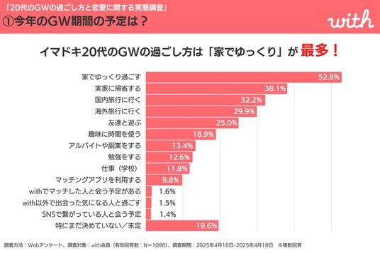 マッチングアプリ「with」「Omiai」の運営統括を行う株式会社エニトグループ(本社:東京都渋谷区、代表取締役グループCEO:野辺 一也、以下:エニトグループ)は、最大11連休となる2025年のGWについて、「with」を利用する20代の男女約1,098名を対象に「GWの過ごし方と恋愛意識に関する実態調査」を実施しました。