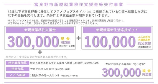 富良野市に移住して市内の事業所に就職した方に、支援金等を交付します。