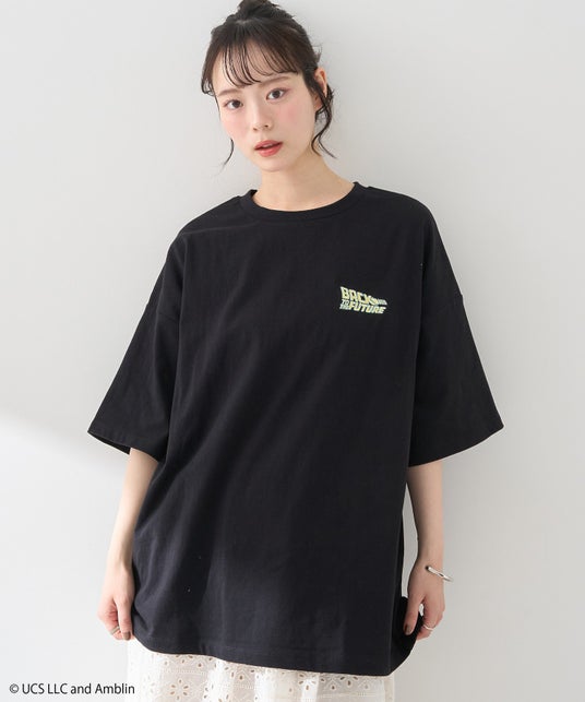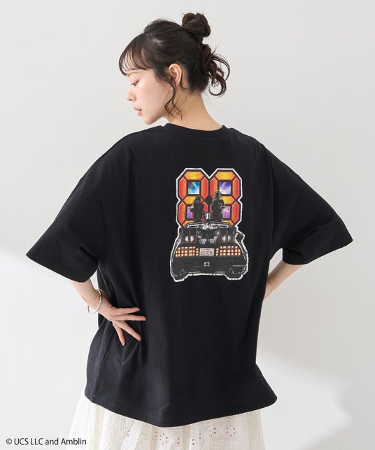 本コラボでは、カラフルなプリントが映えるブラックTシャツに、作品のタイトルロゴや自動車型のタイムマシンなど、映画を象徴するプリントを施しました。