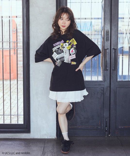 ゆったりとしたビッグTには、主人公の高校生「マーティ」が乗りこなすスケートボードやその親友である科学者「ドク」が飼っていた愛犬「アインシュタイン」などをステッカー風に散りばめました。また、「マーティ」と「ドク」がタイムマシンに乗ってタイムトラベルをする様子をバックプリントしたTシャツもラインアップ。
