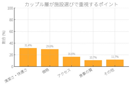 特筆すべきは、カップル層が「施設の清潔さ・快適さ」を全体平均(23.3%)よりも高く評価していること。これは快適な空間でリラックスしたいという願望の表れと言えるでしょう。また、「食事の質・バーベキュー体験」を重視する割合も全体よりも高くなっています。