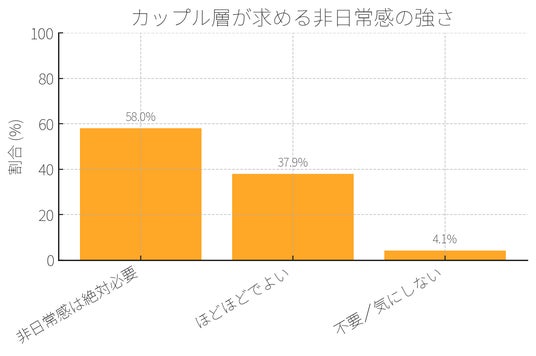 まず第一に「非日常感」。日々の生活から離れ、特別な空間でパートナーとだけの時間を過ごしたいという願望です。58.0%が「非日常感は絶対に必要」と回答しており、通常のホテル宿泊とは異なる体験を強く求めていることがわかります。