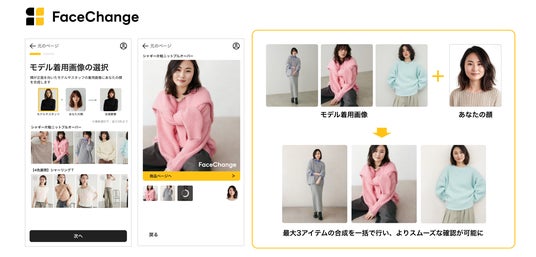 今回、新たに追加された機能では、複数のアイテムに対し、自分の顔を一括で合成できるようになりました。さらに、「お気に入りページ」でも顔合成された着用イメージを表示できるようになり、気になるアイテムを自分の顔で手軽に確認いただけるようになっています。