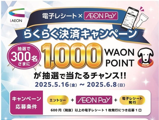 こうした中、電子レシートのさらなる利用促進に向けて6月8日(日)までの期間中、AEON Pay決済で1回600円(税抜)以上の電子レシートを発行すると、抽選で300名さまに1,000WAON POINTが当たるキャンペーンを実施しています。