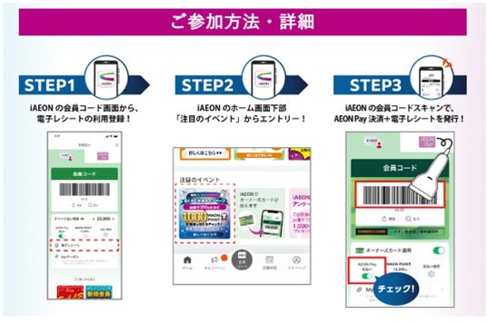 応募方法:1.iAEONの「会員コード画面」から電子レシートの利用登録。