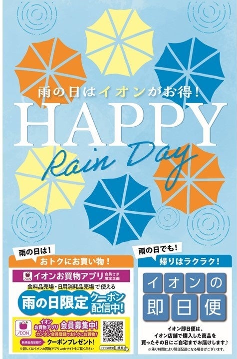 店舗やネットスーパーで使える「雨の日クーポン」の配信や、「イオンの即日便」などのサービスをご利用いただくことで、気分が落ち込みがちな梅雨の雨の日も、イオンで楽しく快適にお得にお買物いただけるサポートを実施してまいります。