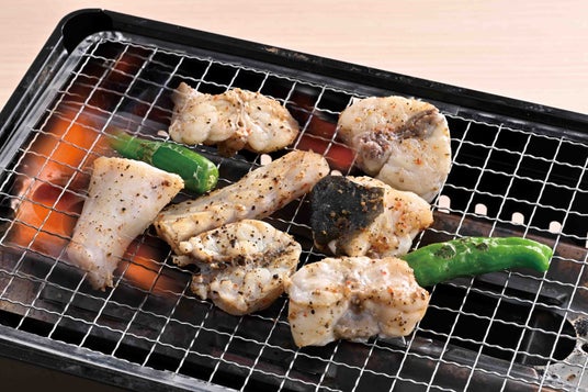 焼きふぐ二種盛り~真ふぐブツと とらふぐアラ身~卓上のコンロで焼いてお召し上がりいただきます。こだわりスパイスが決め手!!真ふぐのブツと、とらふぐのアラ身の2種類をお楽しみください!