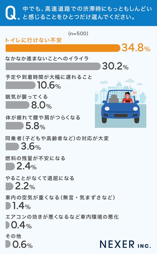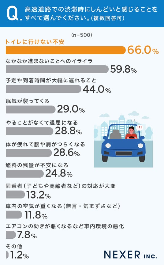 ■高速道路での渋滞時に困ること、66%が「トイレに行けないのが不安」