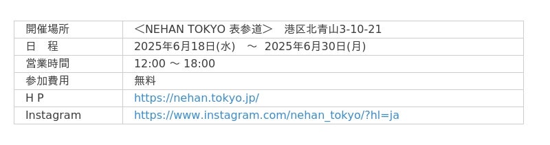 馬居化成工業株式会社(本社:徳島県鳴門市 代表取締役:馬居正治)が運営する〈NEHAN TOKYO〉は、2025年6月にブランド誕生から10周年を迎え、それを記念し「NEHAN展」を6月18日(水)に開催。