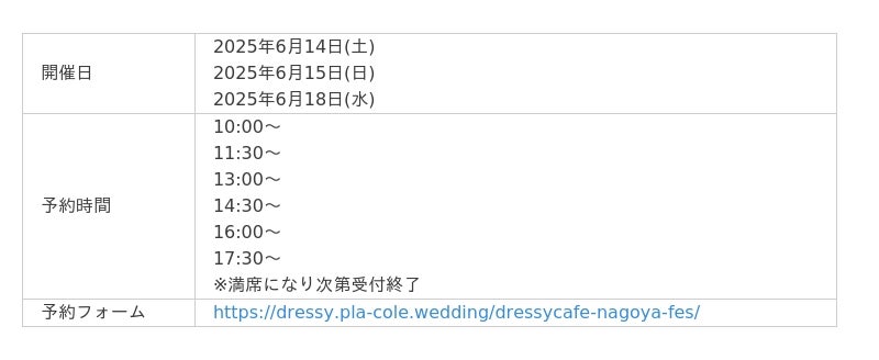 「PLACOLE & DRESSY」ブランドを展開する、冒険社プラコレ(本社:神奈川県鎌倉市、代表取締役CEO:武藤功樹)は、名古屋駅直結商業施設KITTE名古屋3F、ウェディングのテーマパークカフェ”DRESSY CAFE”にて、6/14(土)15(日)18(水)の3日間限定で、これから結婚式をお考えのカップル様に向けた、個室相談やウェディングドレス試着ができる豪華特典付きのウェディング初体験フェスを開催いたします。(40組様限定、無料開催)