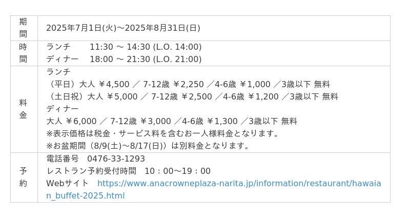 ANAクラウンプラザホテル成田(成田市堀之内 総支配人 ダヴィデ・ザナルディ)では、7月1日(火)から8月31日(日)の2か月間限定で「トロピカル・ハワイアンビュッフェ」と「トロピカル・アフタヌーンティー」を 1F レストランカフェ「セレース」にて開催いたします。